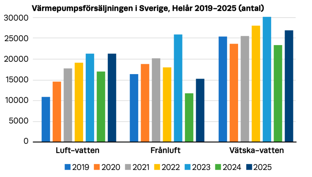 Under 2025 ökade försäljningen av värmepumpar på den svenska marknaden inom samtliga segment. Störst ökning noteras för frånluftsvärmepumpar med 28 procent, tätt följt av luft/vattenvärmepumpar som ökade med 24 procent. Även för bergvärmepumpar konstateras en tydlig ökning under fjolåret med 14 procent upp.